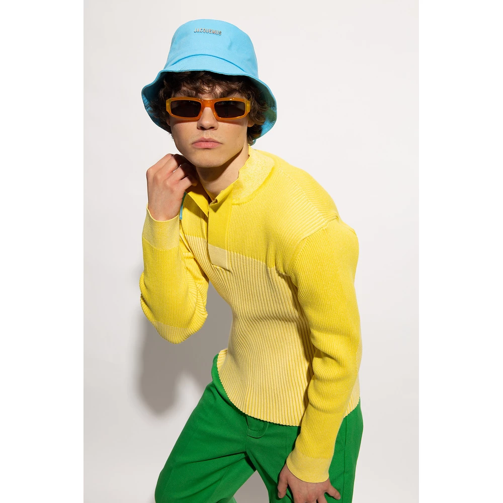 Oransje og gule ‘altu’ solbriller fra Jacquemus. Denne modellen har sølvfarget metallvare for gullfarget metall, inkludert eyelets på spissene, og har sertifisert grå linser med 100% UVA/UVB-beskyttelse med speileffekt i oransje. Saken inkludert.